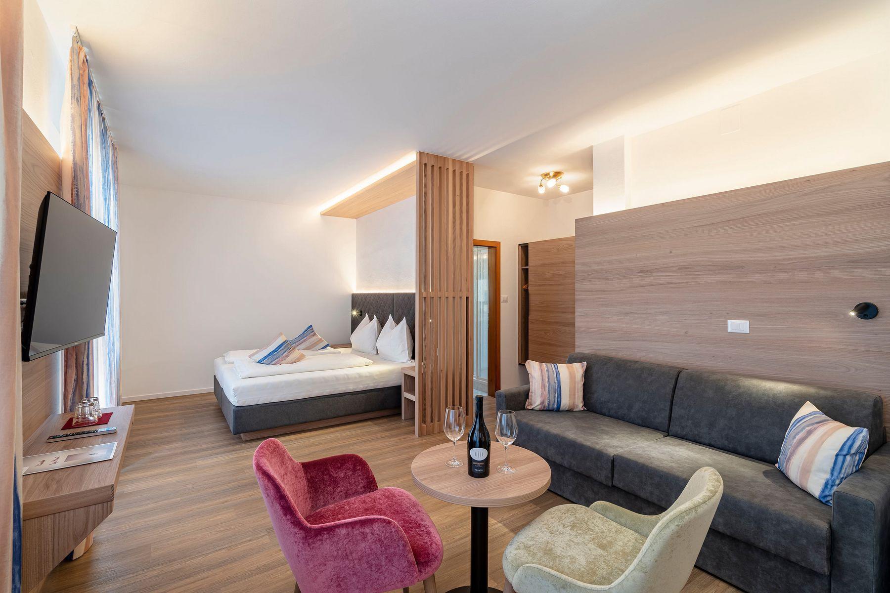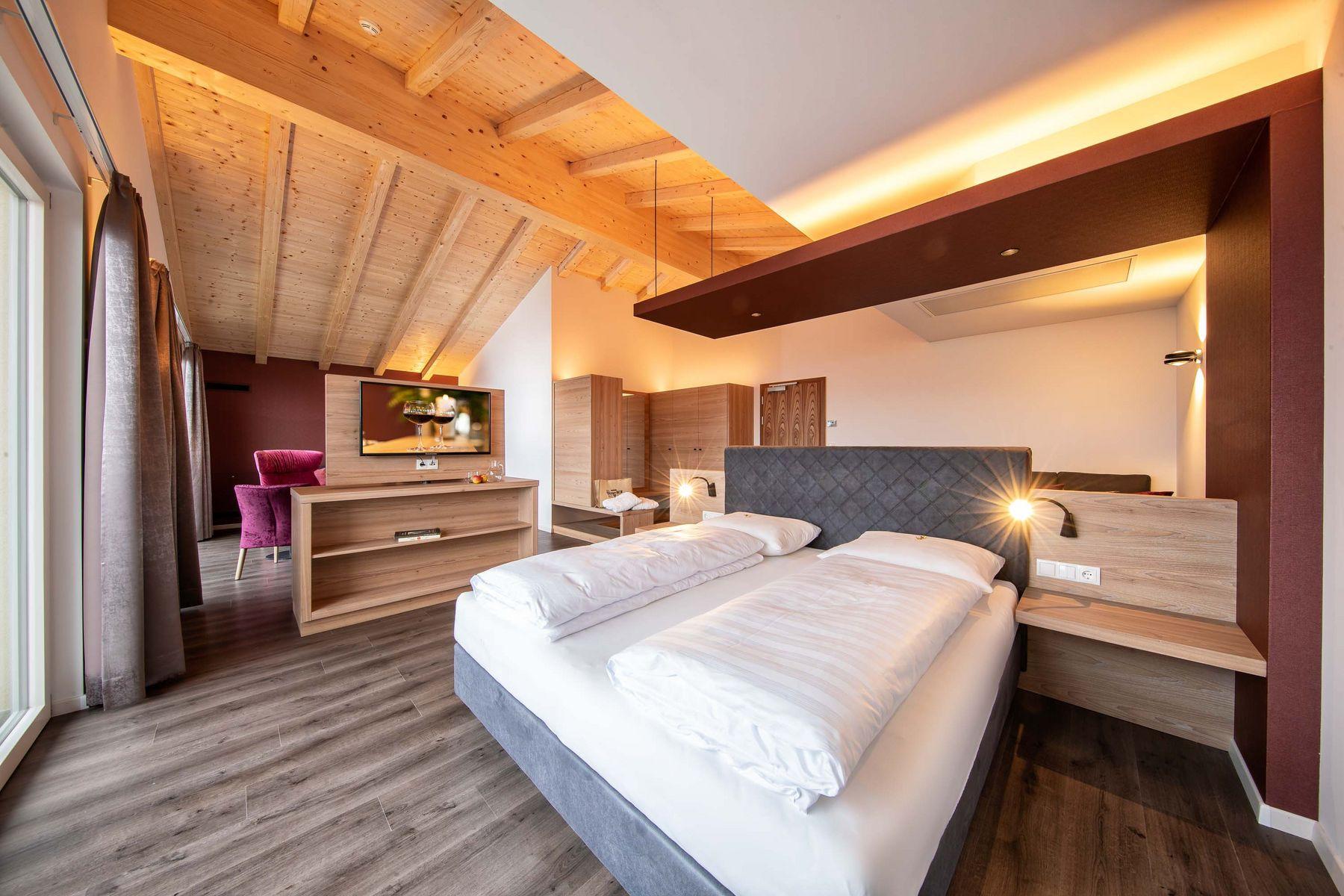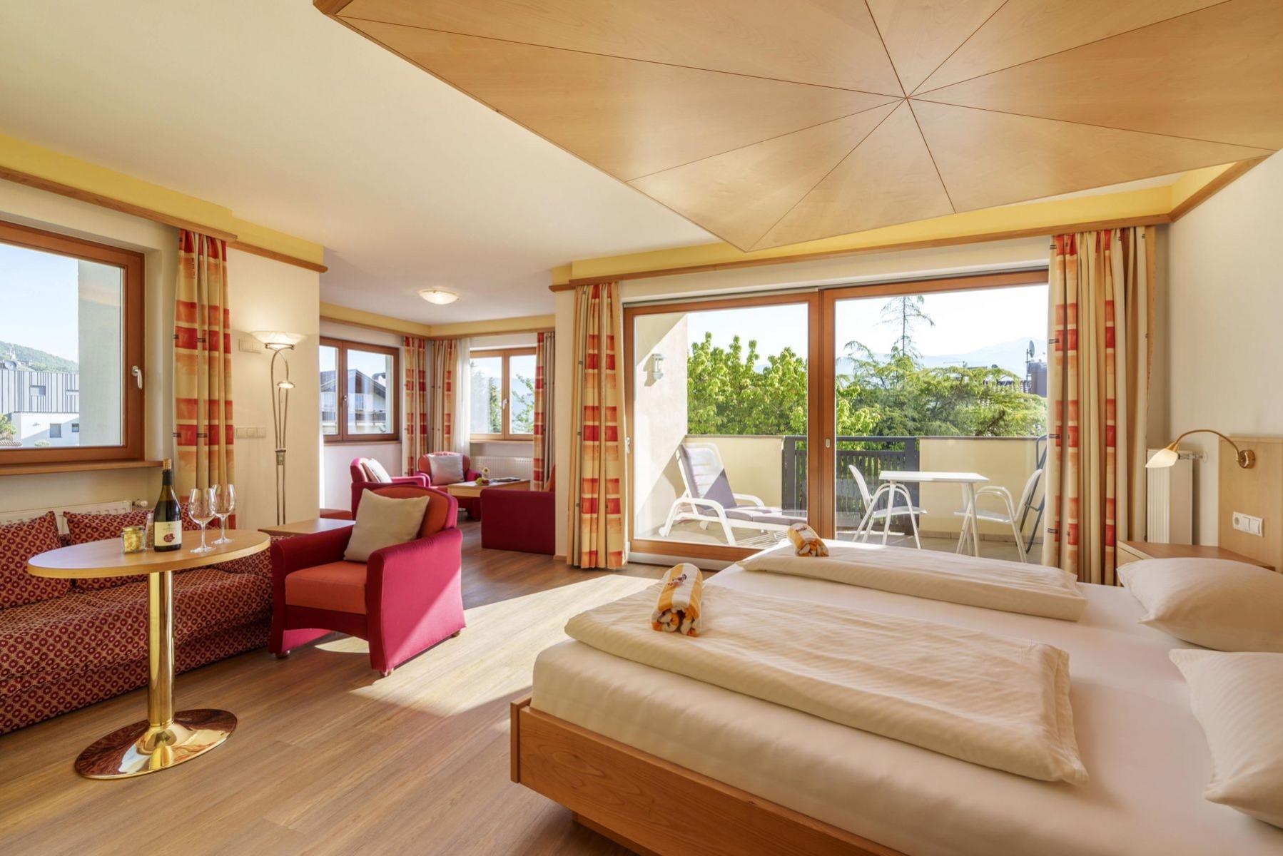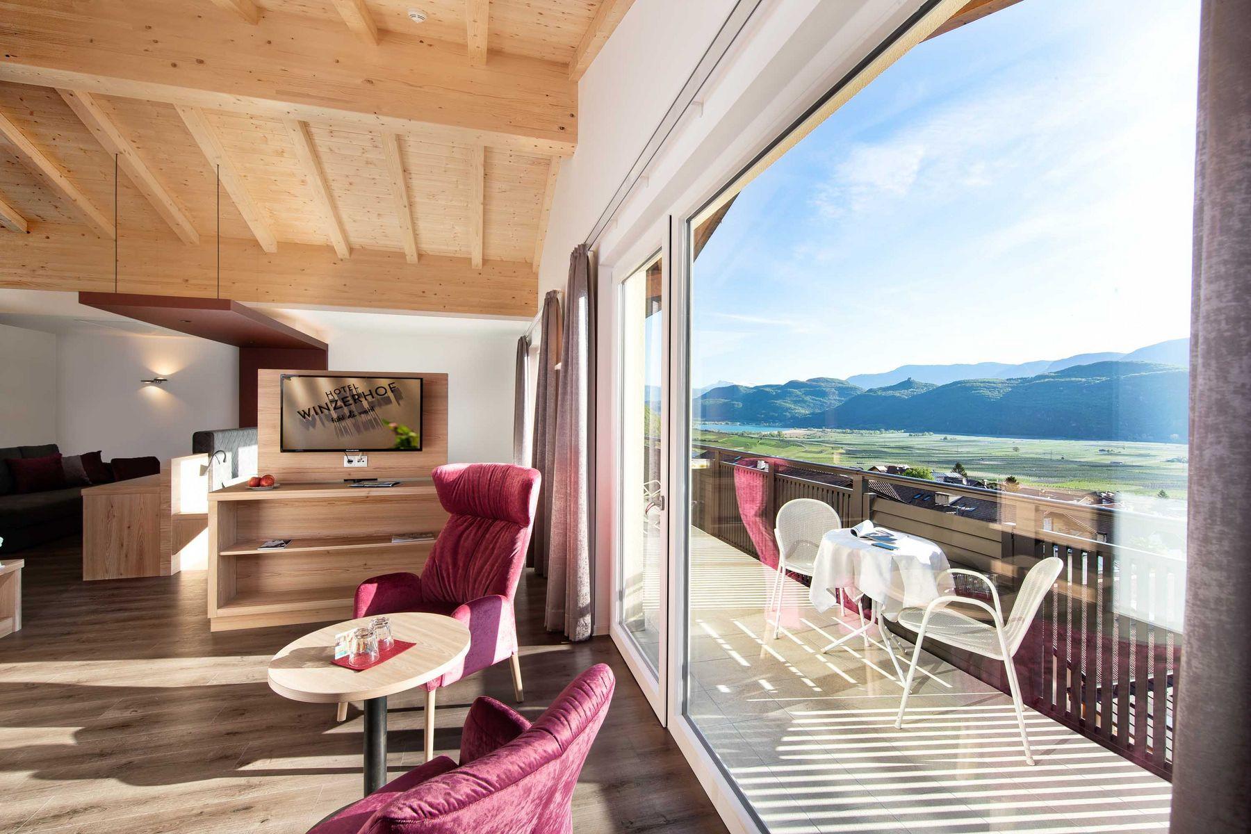 Freu Dich auf individuell gestaltete Zimmer und Suiten mit einem weiten Blick über die Obstwiesen und Berge bis hin zum Kalterer See.