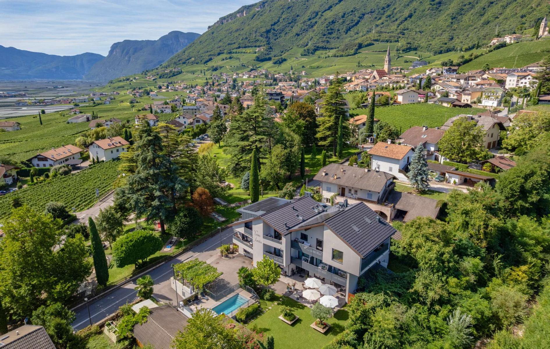 This is exactly what you can expect from the south of South Tyrol: nestled between endless vineyards and apple orchards and surrounded by impressive mountains.